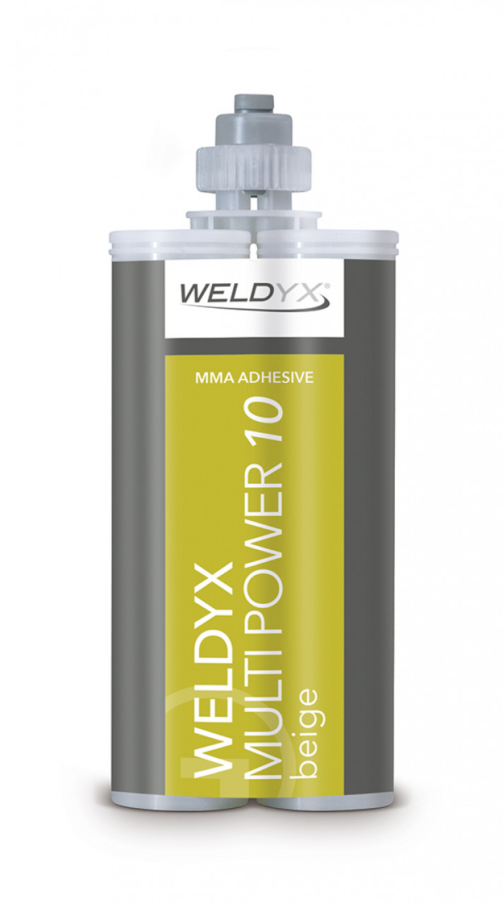 A WELDYX® Multi Power 10 beige egy kétkomponensű, 1:1 arányú metakrilát ragasztó, amely nagy szilárdságú és szerkezeti ragasztásra szolgál. A termék alkalmas különféle kompozitok, műanyagok és fémek, akár tűzihorganyzott felületek ragasztására, széles tapadási spektrumának köszönhetően a felület előkezeléséhez nincs szükséges alapozóra. Ezenkívül a termék a reakció befejezése után kiváló ütés-, hámlás-, nyomás- és fáradásállóságot biztosít, ami azt jelenti, hogy akár többrétegű követelményprofilok is megoldhatók.